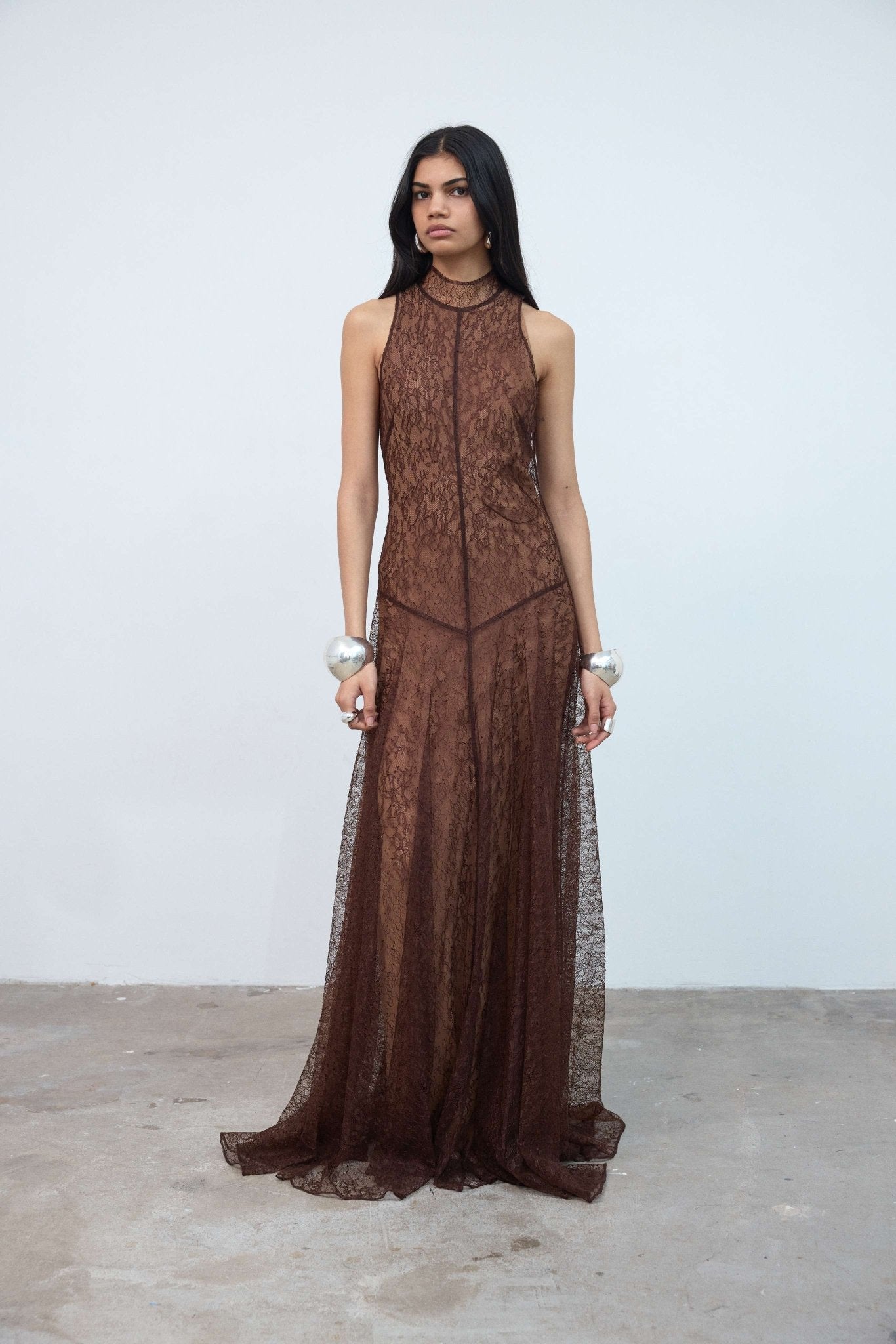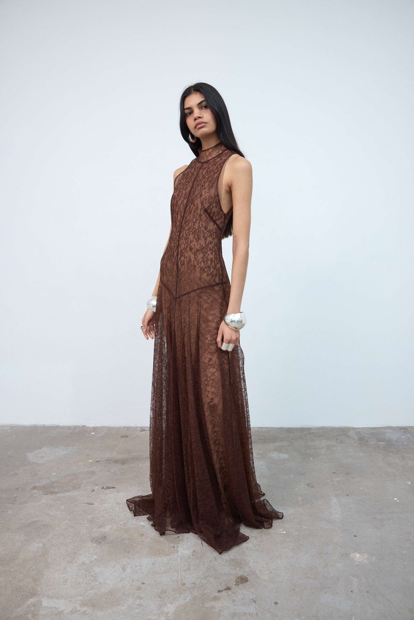 SILENTIUM MAXI DRESS IN CHOCOLATE BROWN LACE