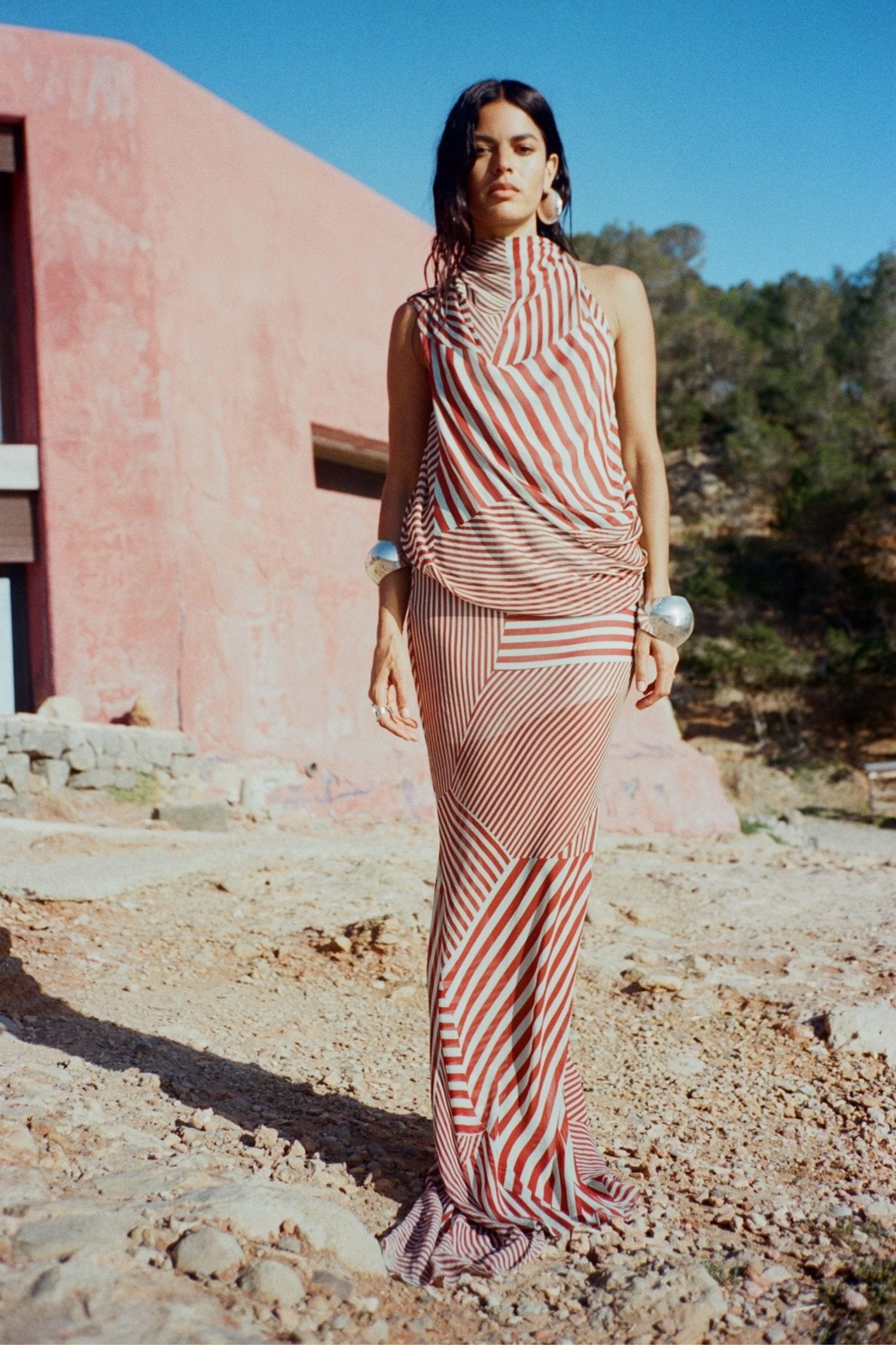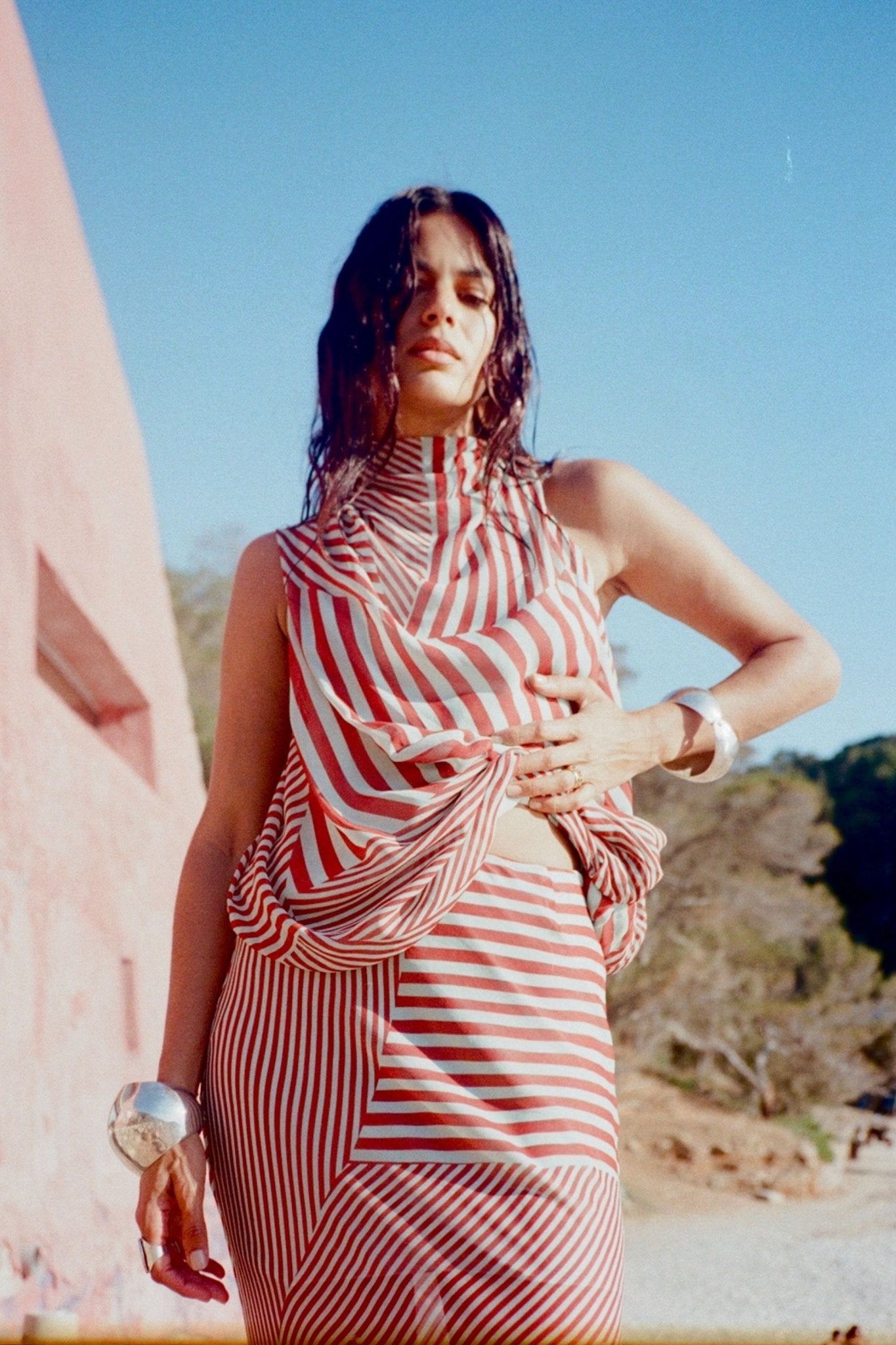 DIOSA SKIRT IN MAROON & TURQUOISE STRIPE GEORGETTE