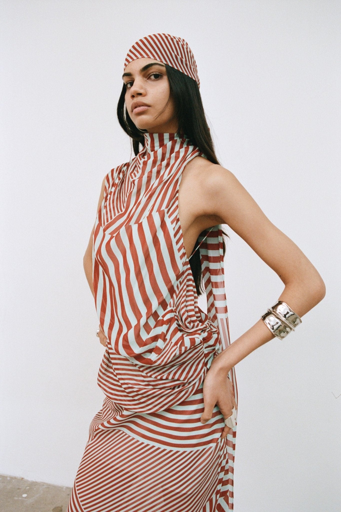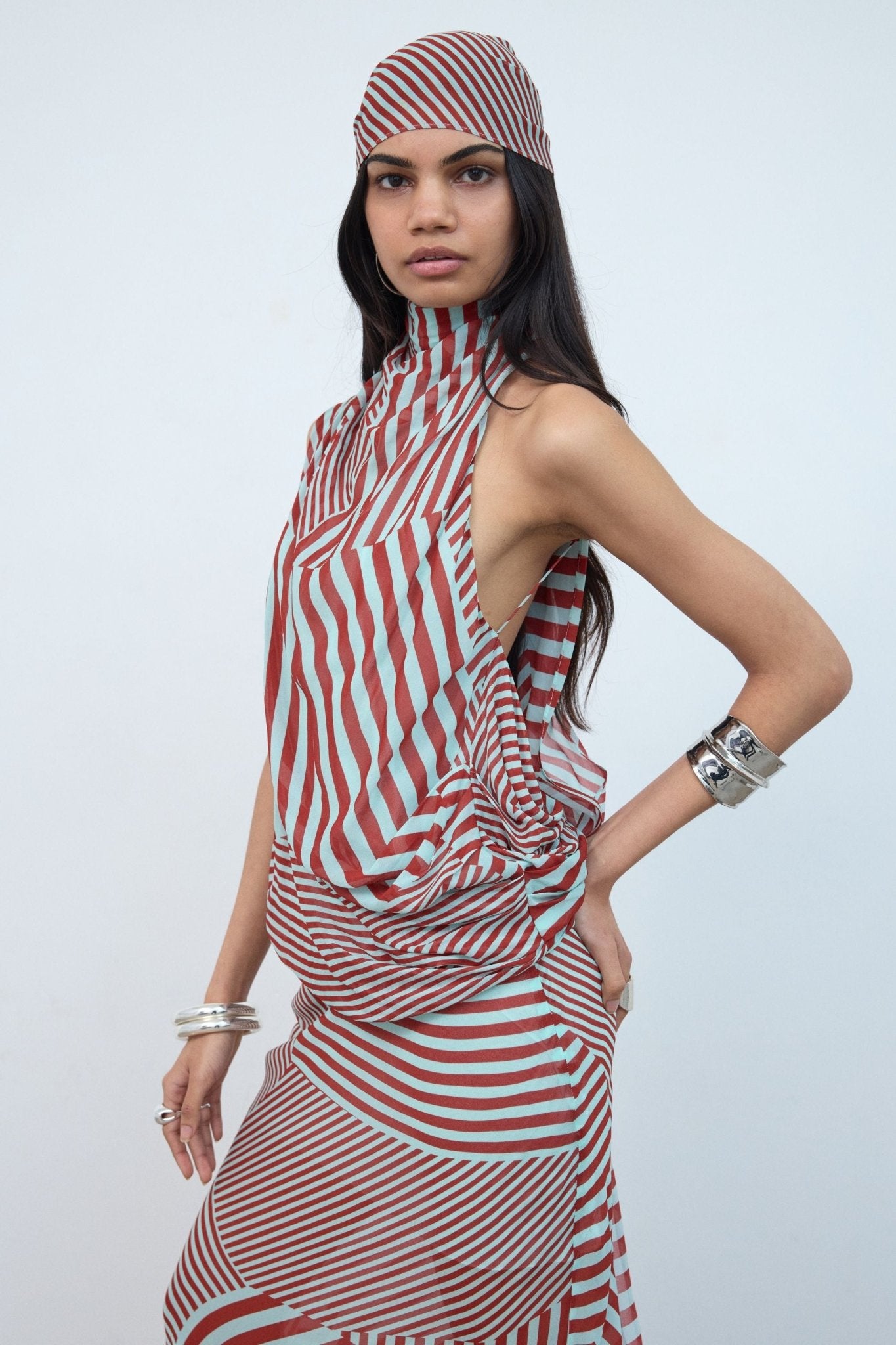 LUNA HEAD SCARF IN MAROON & TURQUOISE STRIPE GEORGETTE