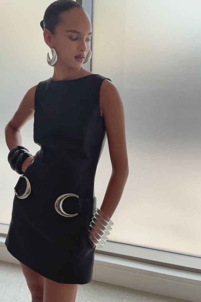 The Ayda Mini Dress is a sculptural silhouette defined by clean lines and quiet elegance. Cut to skim the body with soft structure, a streamlined neckline and subtle shaping through the waist create a poised, intentional line. Crescent moon–shaped hardware anchors the design, introducing a refined celestial detail that feels both modern and instinctive. Minimal yet expressive, Ayda moves with confidence and calm authority.