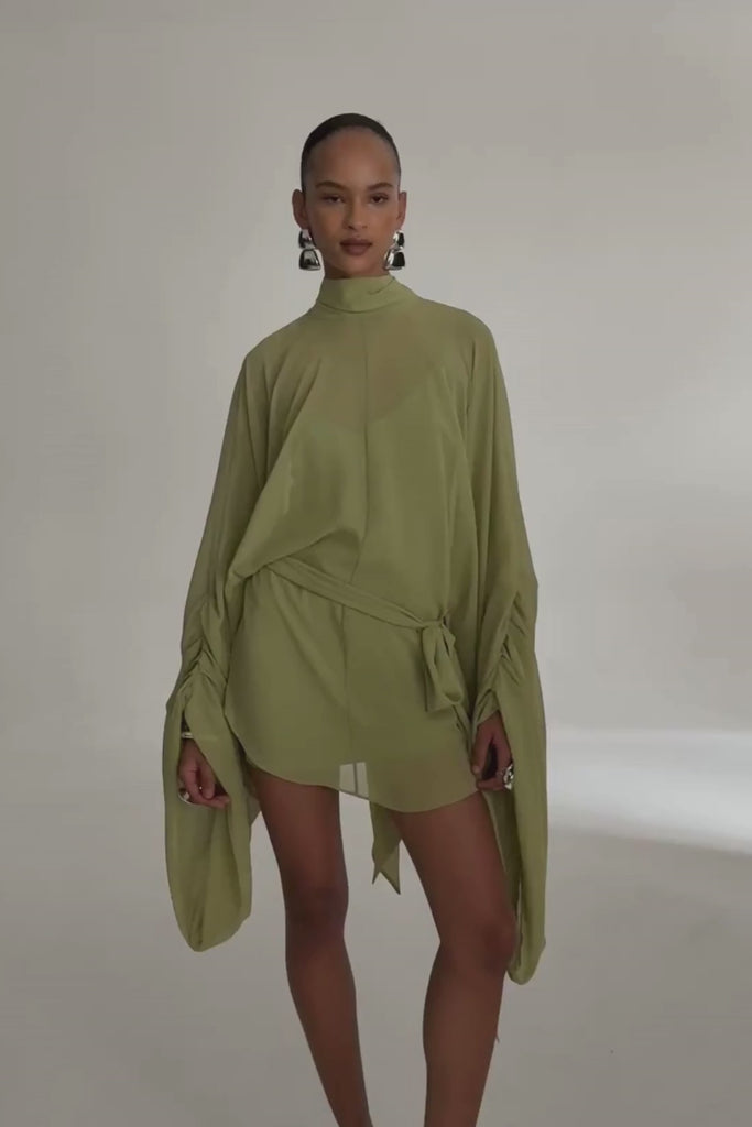 The Nila Mini Dress is a fluid, expressive silhouette designed to move with confidence and ease. Crafted in lightweight chiffon, it skims the body softly, allowing light and movement to pass through its billowing sleeves and layered folds. Effortless yet daring, Nila is made to slip seamlessly from sun-warmed days into long, after-dark moments.